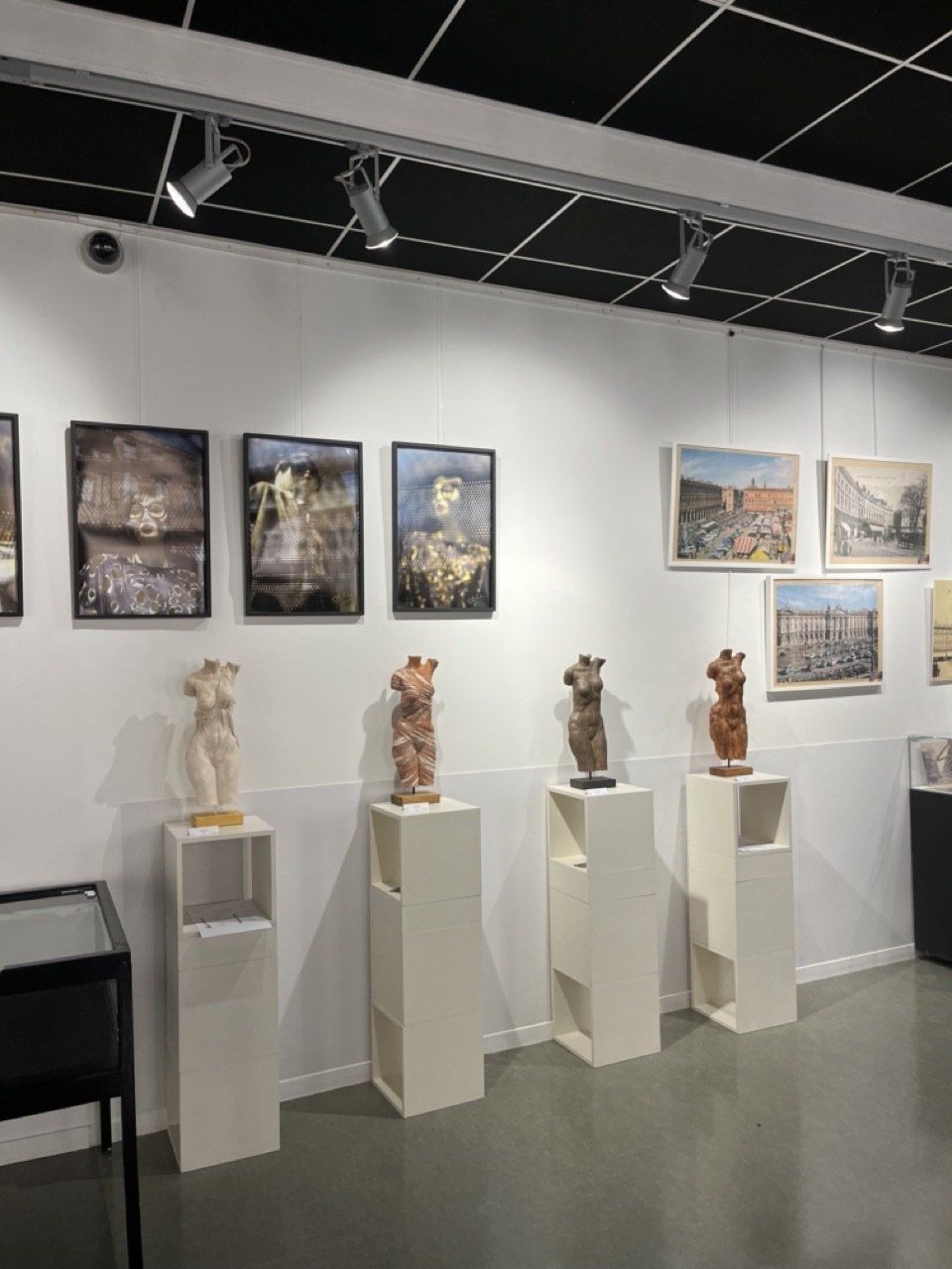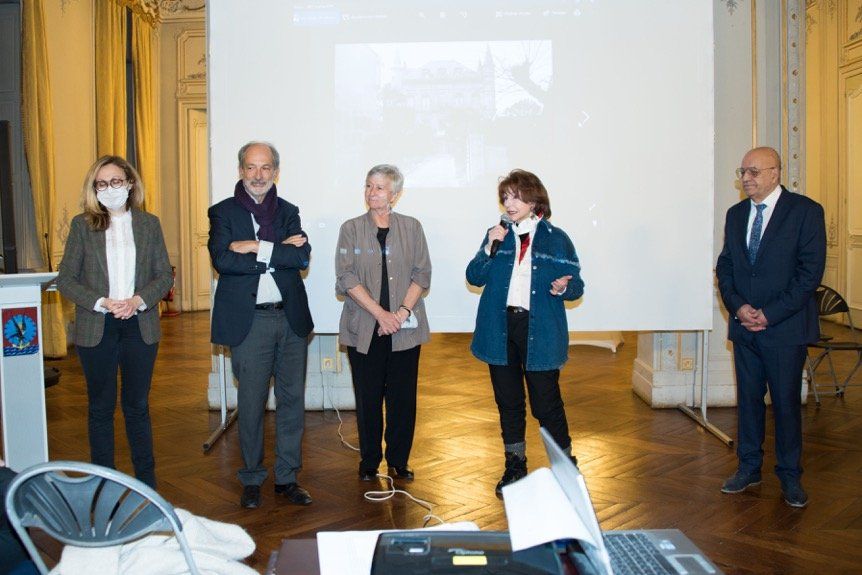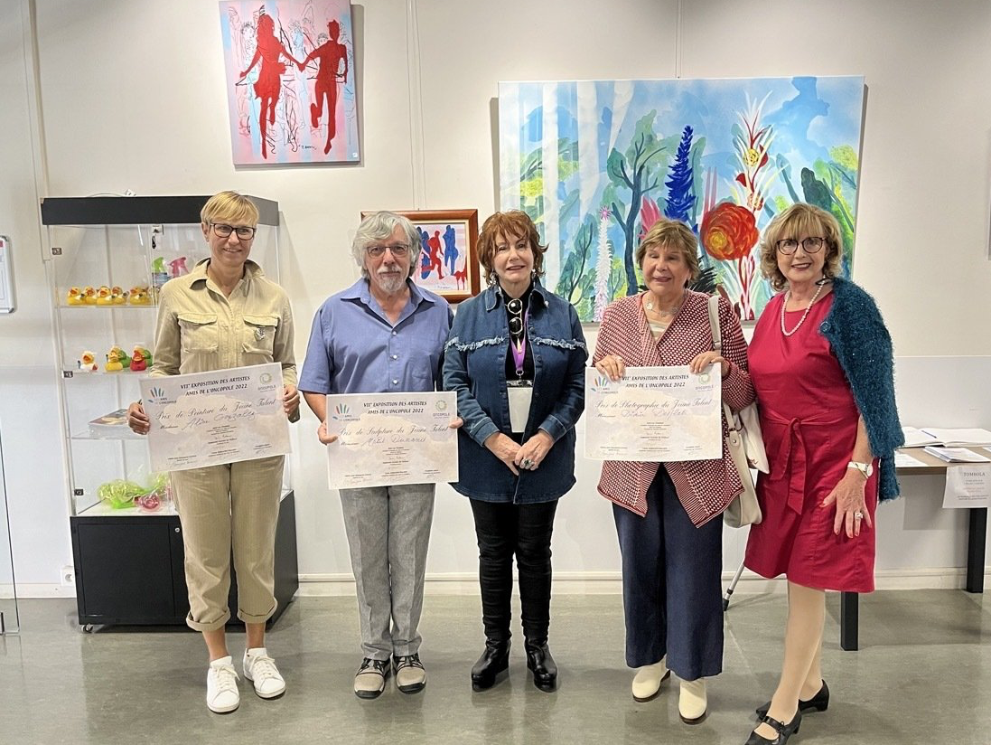 Le Maire de Touolouse Jean Luc Mouden honore de sa présence au stand des Amis de l'Oncopole. À sa droite Marie Bourgeois Ferrero, la présidente Yanne Reschini Descaire - à sa gauche Elisabeth Grech, commissaire de l'exposition des artites des Amis de l'Oncopole et Marie Francine Druillet ainsi que Jean de Madron Trésorier