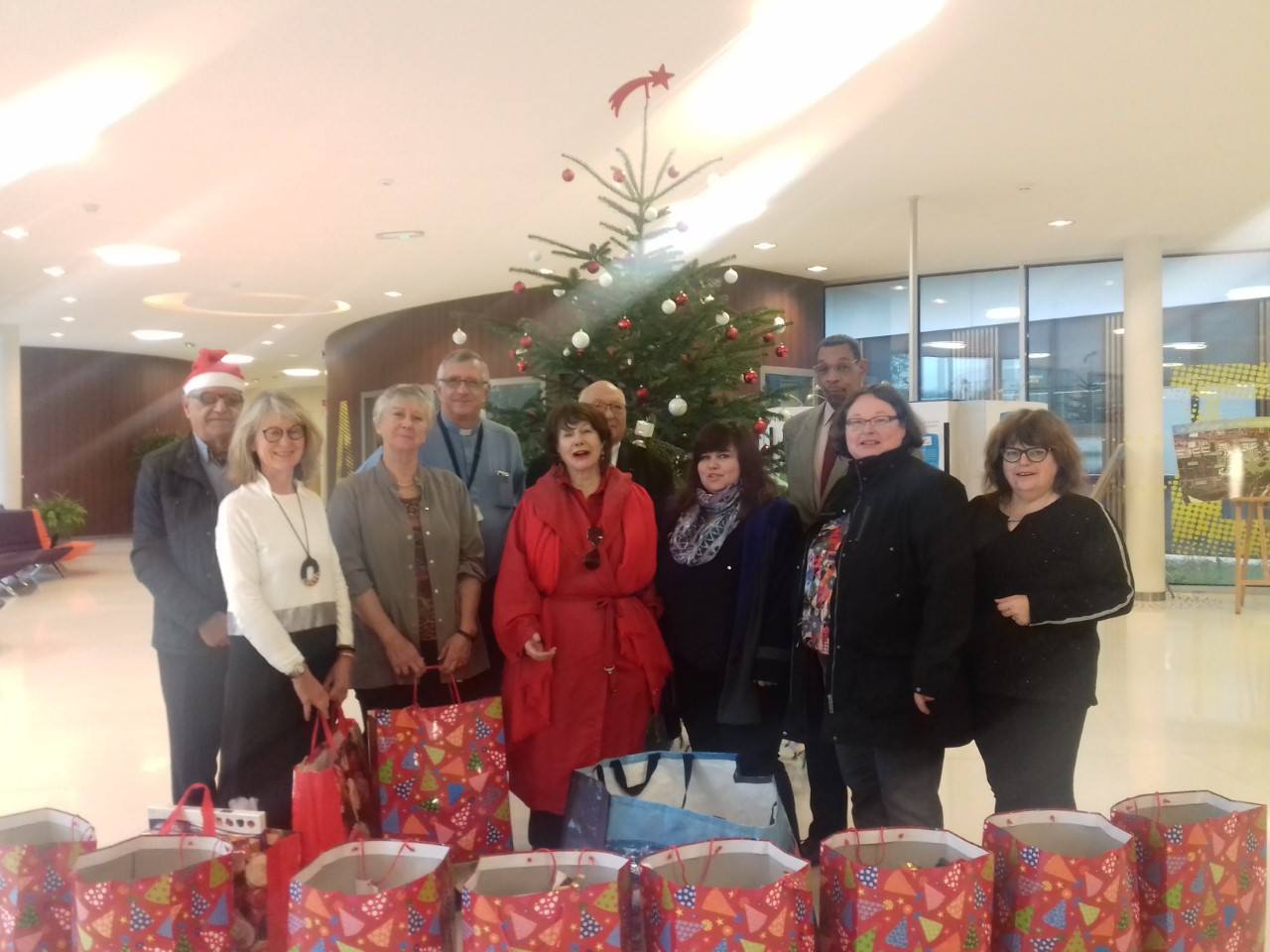 Les Amis de l'Oncopole se rendent auprès des malades chaque année pour offrir une étole aux femmes et une écharpe aux messieurs. Grand moment d'émotion partagé avec le personnel d'astreinte à qui est offert une boite de chocolat et des petits papas noël éclairés