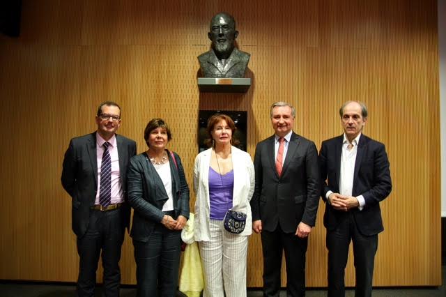 Le Maire de Touolouse Jean Luc Mouden honore de sa présence au stand des Amis de l'Oncopole. À sa droite Marie Bourgeois Ferrero, la présidente Yanne Reschini Descaire - à sa gauche Elisabeth Grech, commissaire de l'exposition des artites des Amis de l'Oncopole et Marie Francine Druillet ainsi que Jean de Madron Trésorier
