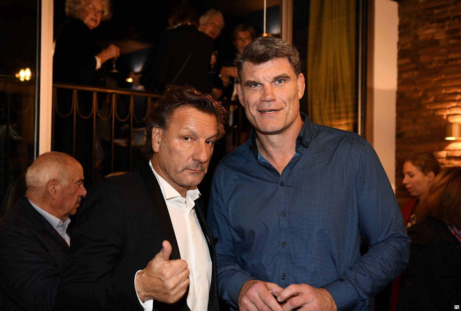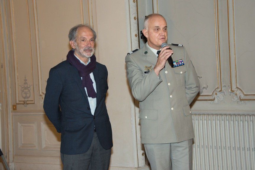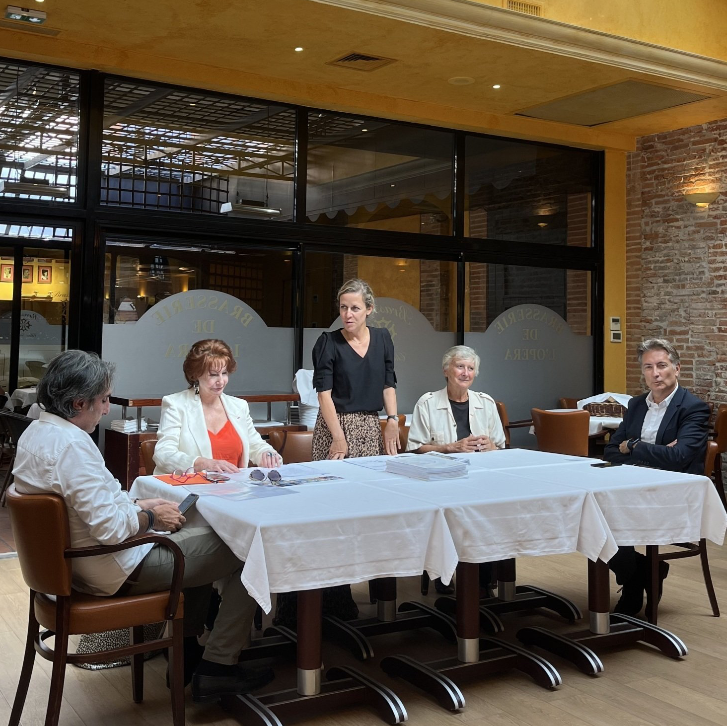 Le Maire de Touolouse Jean Luc Mouden honore de sa présence au stand des Amis de l'Oncopole. À sa droite Marie Bourgeois Ferrero, la présidente Yanne Reschini Descaire - à sa gauche Elisabeth Grech, commissaire de l'exposition des artites des Amis de l'Oncopole et Marie Francine Druillet ainsi que Jean de Madron Trésorier